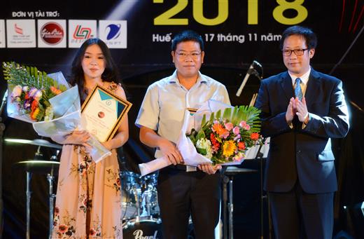 ThS. Nguyễn Hải Lộc - Trưởng Phòng Công tác sinh viên (trái ảnh) và ThS. Cao Thị Hoa - Chủ tịch Hội Sinh viên (phải ảnh) trao Giải Thí sinh có số lượt bình chọn nhiều nhất và Giải Cổ động viên.